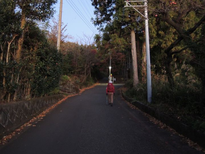 朝陽で落葉が紅く染まっていた。朝から快晴の予感。