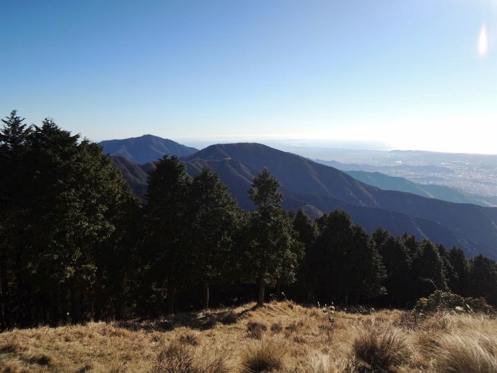 南西側の眺め。真ん中に神山、その右に金時山、位牌岳と越前岳。左には真鶴岬と天城山脈も見える。
