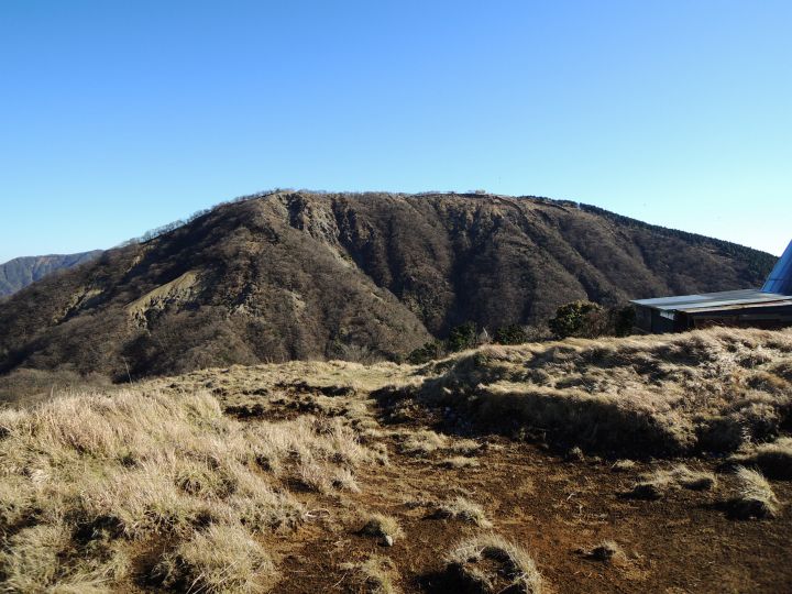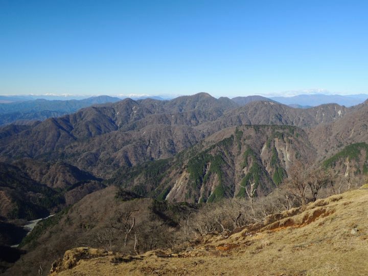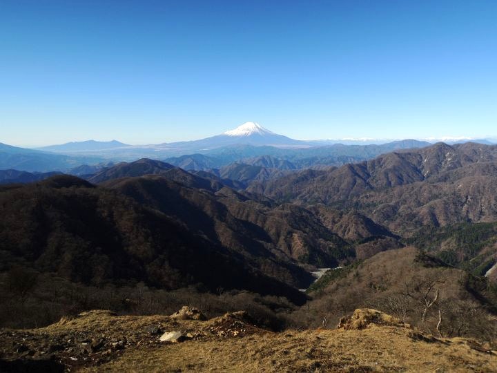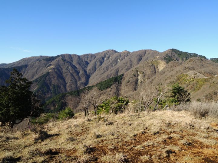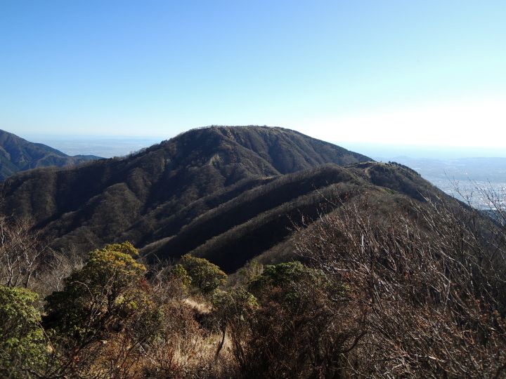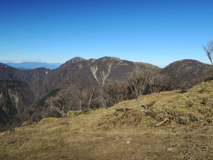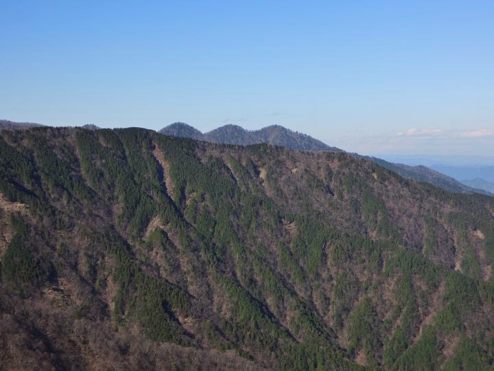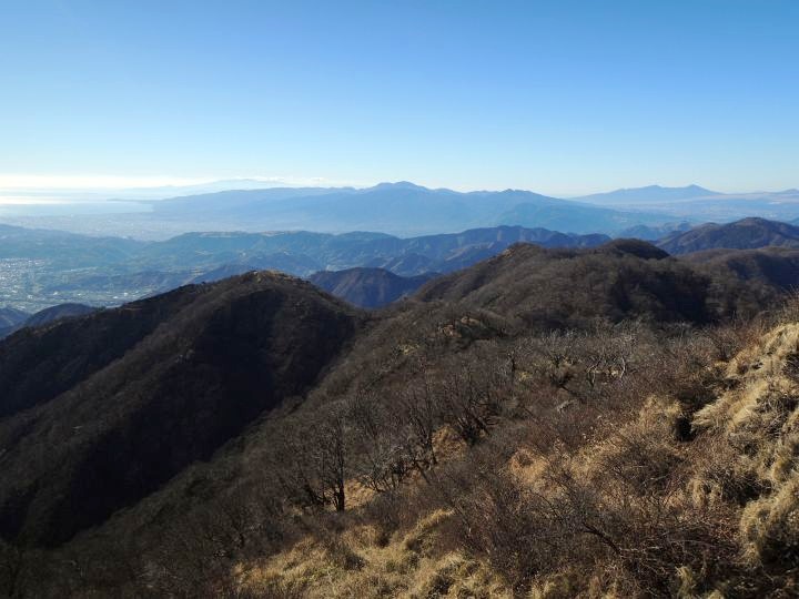 西北西側。同角ノ頭、檜洞丸、大室山が中央に並ぶ。同角ノ頭の左上は御正体山で、その向こうは南アルプス。