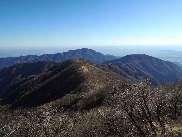 北北西側の眺め。中央に蛭ヶ岳と不動ノ峰、右に丹沢山。左奥には大菩薩嶺や三宝山など奥秩父の山々。