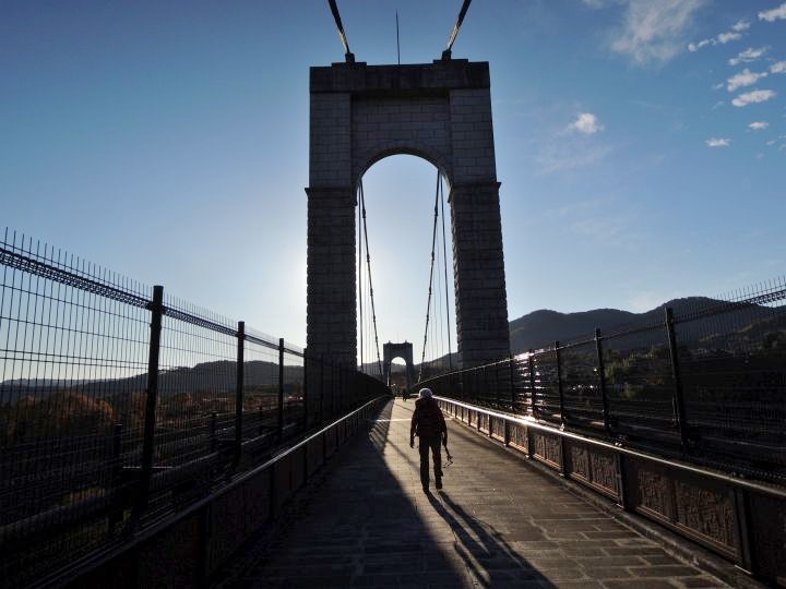 長さ267m、高さ35mの「風の吊り橋」を渡る。逆光が強烈にまぶしかった。