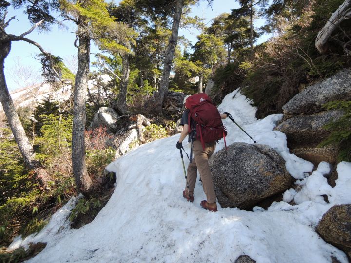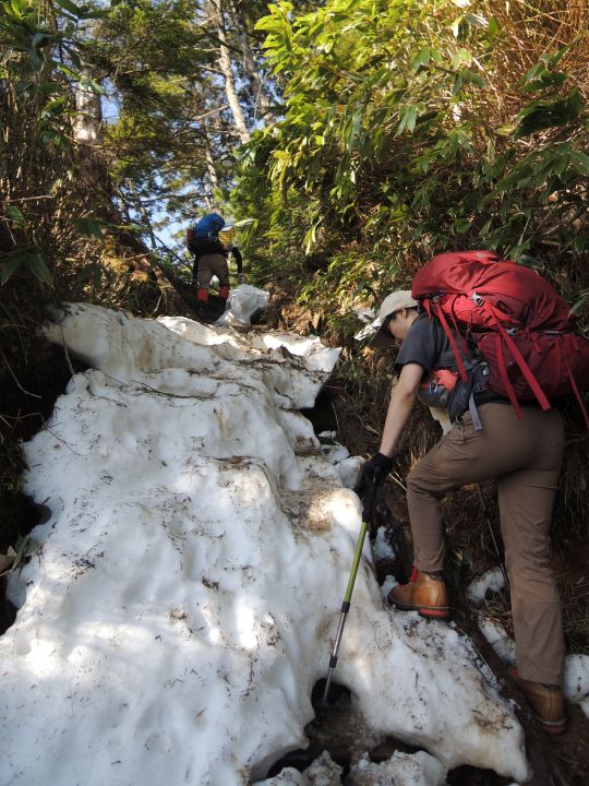 第三ベンチからは雪が増え始めたが、ジャリジャリの腐れ雪で歩きづらかった。