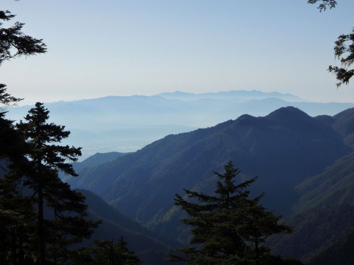 途中で東側の樹間に八ヶ岳が見えた。真ん中あたりに蓼科山、右には南八ヶ岳の赤岳、阿弥陀岳、権現岳、編笠山が並ぶ。蓼科山の左手前は美ヶ原。