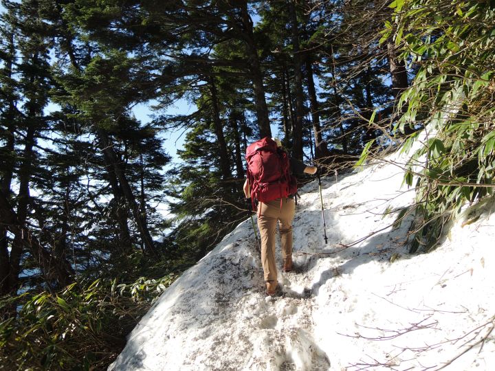 樹林帯に入っても、まだまだ雪の下りは続いた。