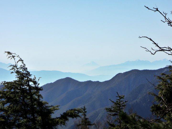 7:25 富士見ベンチに到着。南東側に富士山が見えた。その右には南アルプスの甲斐駒ヶ岳と北岳も見える。この後富士山は、徐々に霞んで見えなくなった。