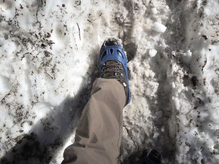 残雪の道が続くようになったので、チェーンスパイクを装着。
