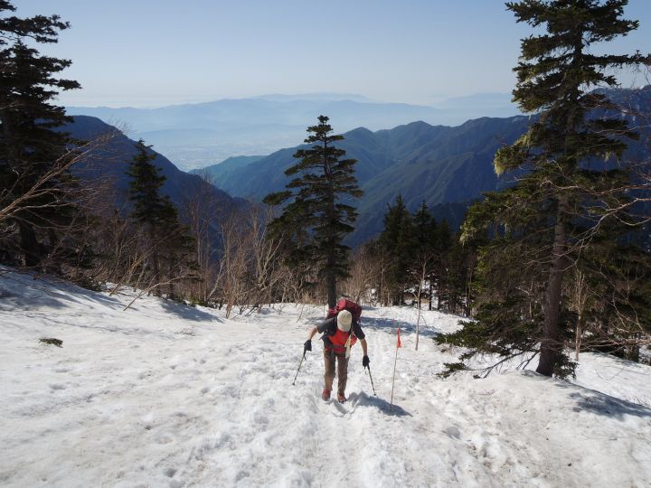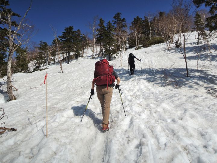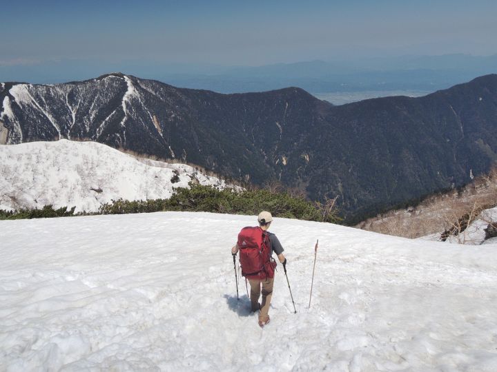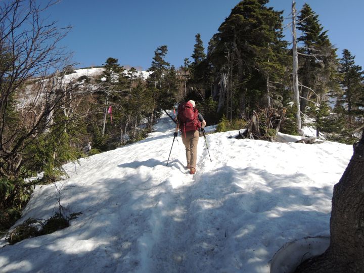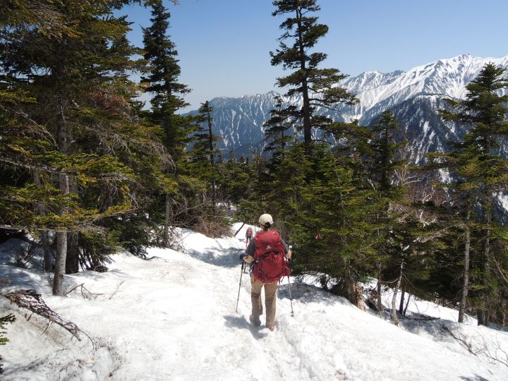 強烈な照り返しの中を下る。ズルズル滑る雪上歩行で、徐々に膝が疲れてきた。