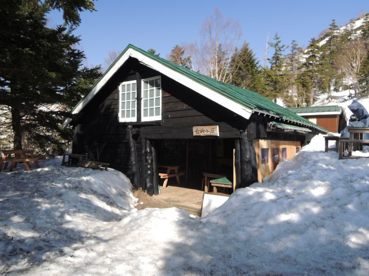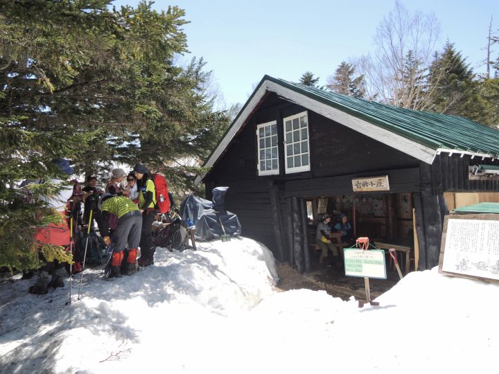 ミニスキーの要領で、バランスを取りながら登山靴を滑らせて下った。12:40 嫁より先に合戦小屋に到着。