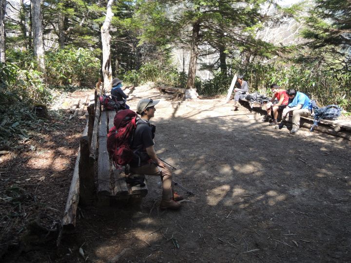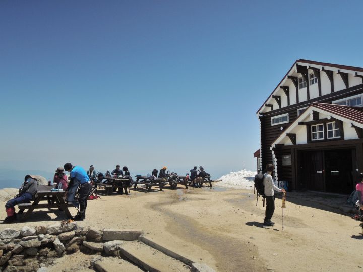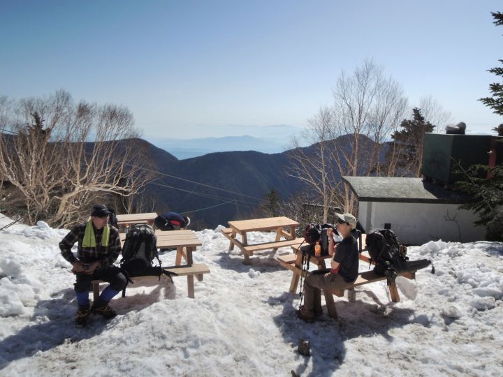 合戦小屋周辺は登山者が大勢いたが、たまたまテーブルベンチが空いたので、座ってひと休みした。