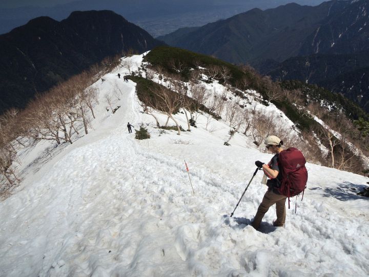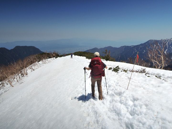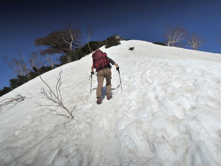 山稜の上には紺碧の空が広がり、ほとんど完全な無風。絵に描いたような登山日和で、コース上のどこかにあると覚悟していた踏み抜き地獄もほとんどなかった。
