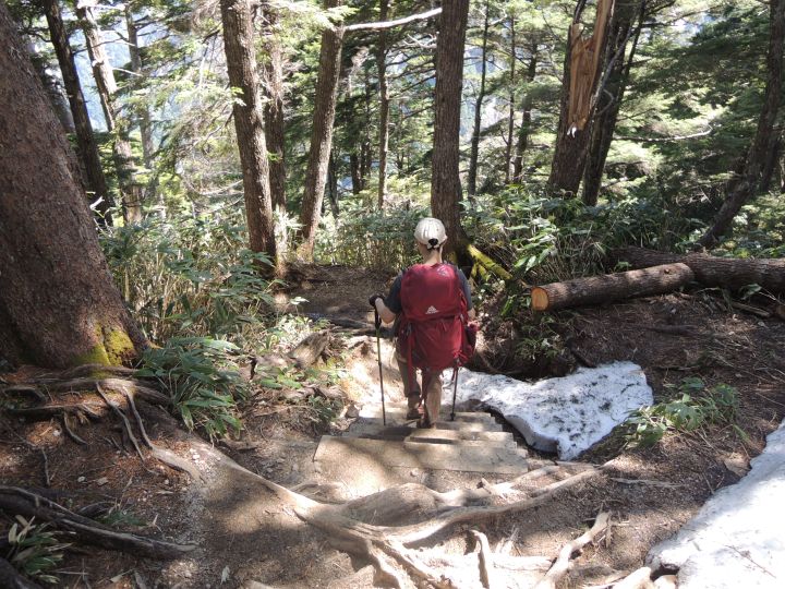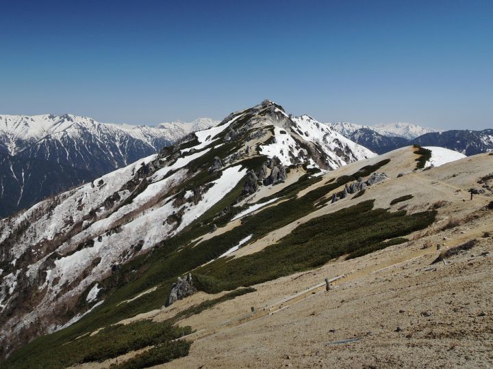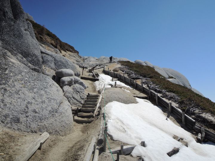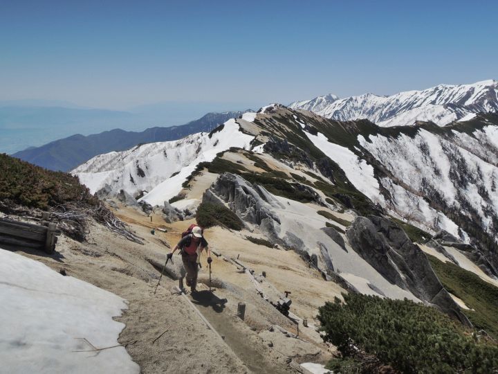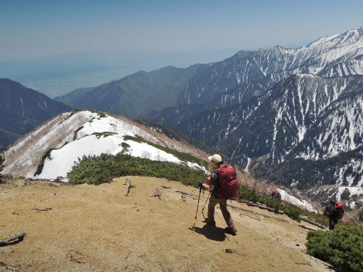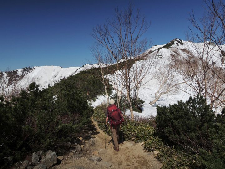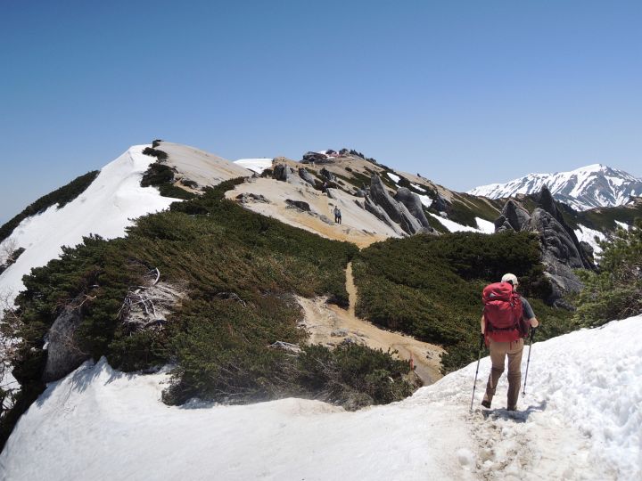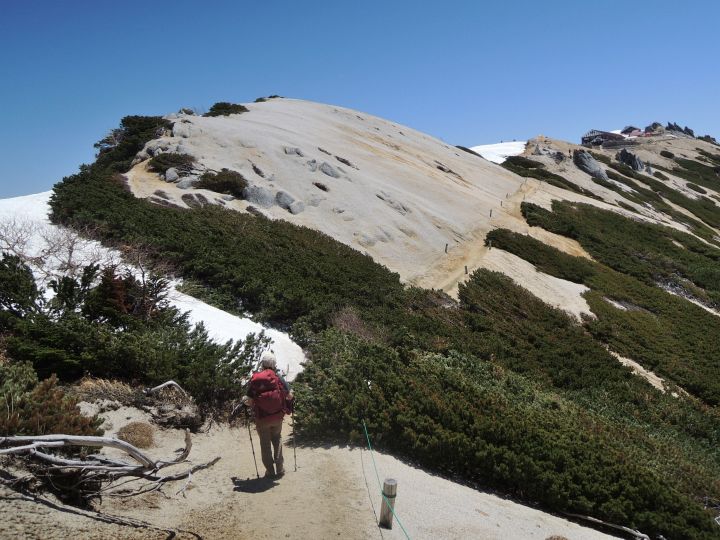稜線上は雪がほとんどなかったので、東側斜面に見える雪に雷鳥がいないか注意しながら歩いた。
