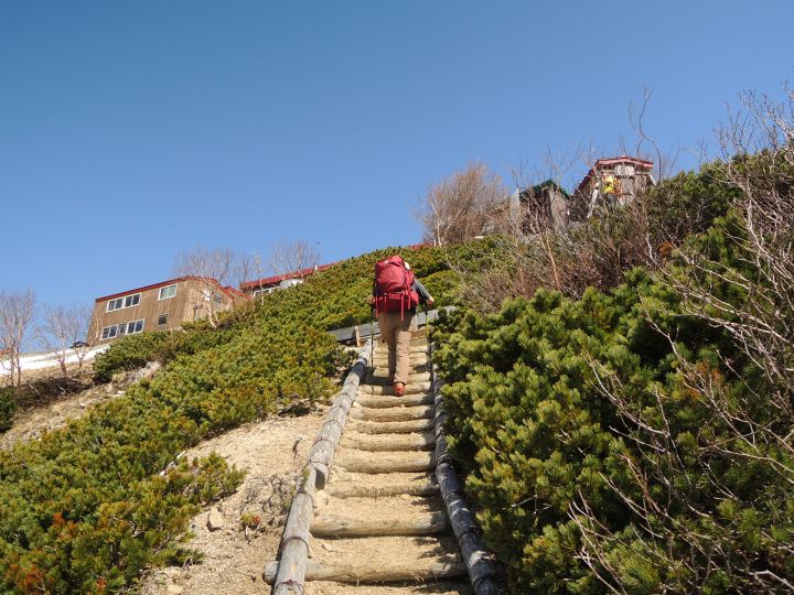 直下の階段を上る。北アルプスの山荘だけあって、近づくとその大きさが分かる。