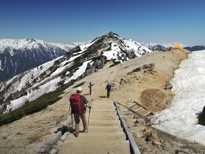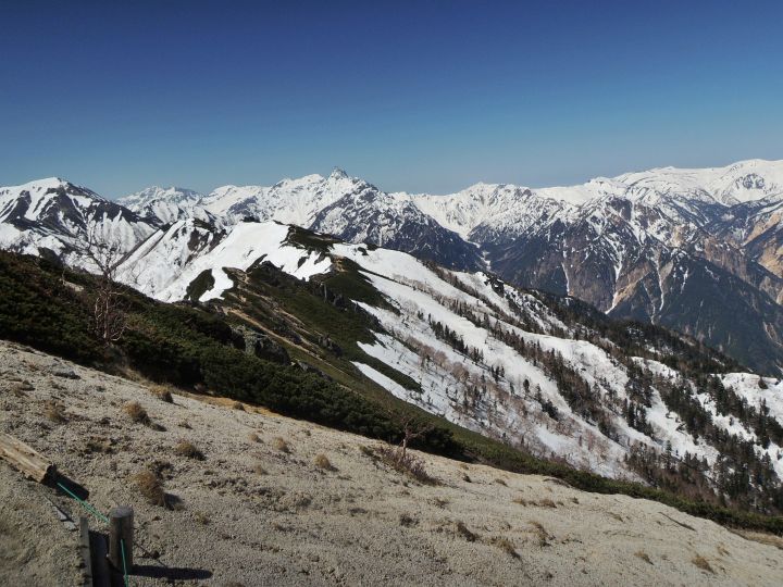 12:00 チェーンスパイクを装着して下山開始。大満足である一方、下山するのが名残惜しい。これだけの大展望を日帰りするのはやはりもったいないわけで、北アルプスは絶対に泊まりで来るべきだと感じた。