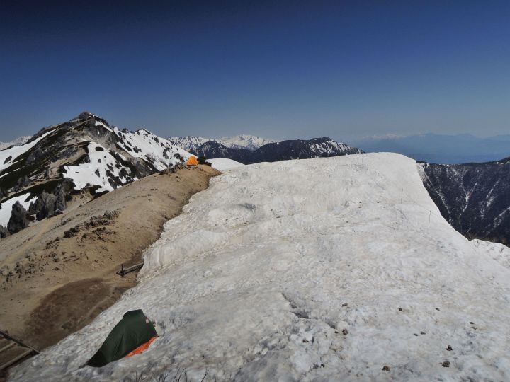 燕山荘の北側稜線には雪に覆われたテント場があった。遙か右奥に見えるのは妙高連山。