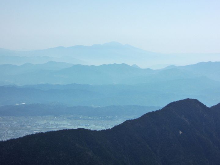 東方面。有明山の向こうに安曇野の市街地。美ヶ原や八ヶ岳、南アルプスはうっすら見える程度だった。