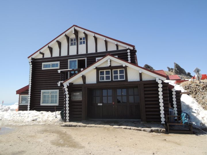 9:30 燕山荘(2,704m)のフロントに到着。新しく塗装したのか真新しく見えた。チェーンスパイクを外して、ひと休みした。