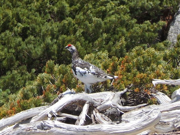 ハイマツを越えると左手の東側斜面に残雪が見えたので、砂礫の山を少し登って雪上を眺めようとしたところ、目の前を雷鳥が飛んでいった。岩陰に見失ったが、50mほど戻った地点の男性2人が何かを見つけたようなので、ザックを置いて引き返した。