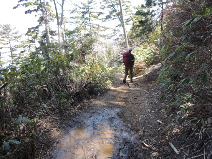 雪解け水で山道が水溜まりになっている箇所も出てきた。#