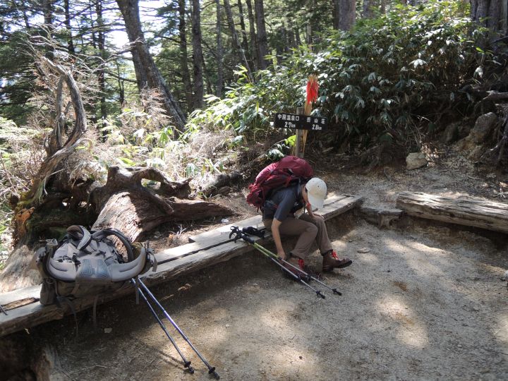 さらに下って、14:25 第一ベンチでも5分休憩。下りに強い嫁とは対照的に、最後は私の方がへばっていた。