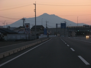 朝焼けの空に筑波山が見えてきた。