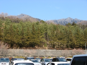 駐車場から見た男体山と女体山。