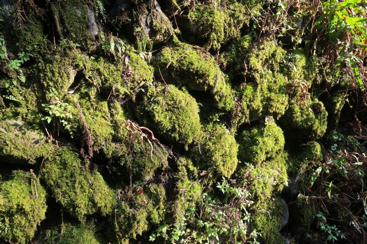 苔に覆われたコンクリートの壁。