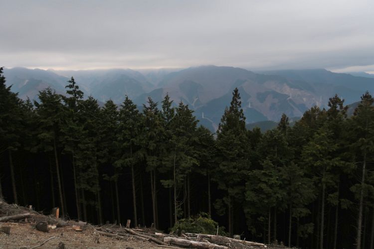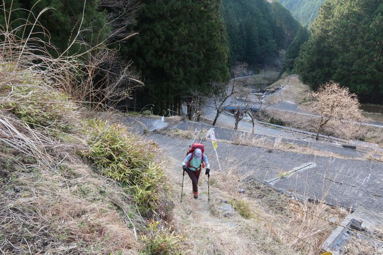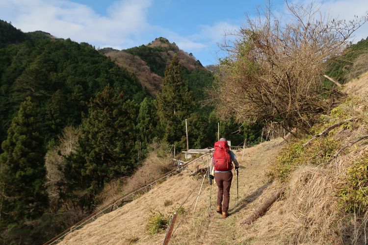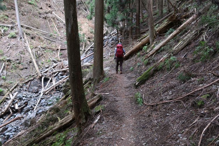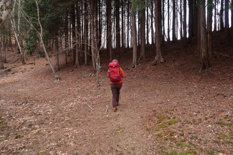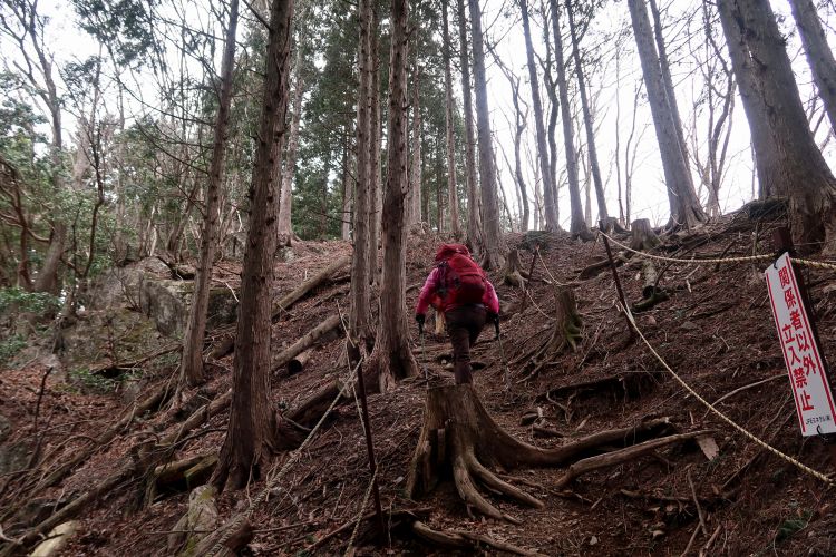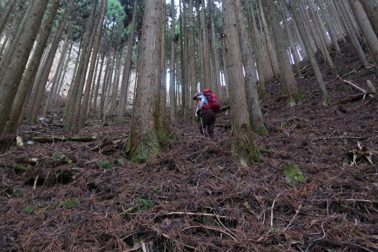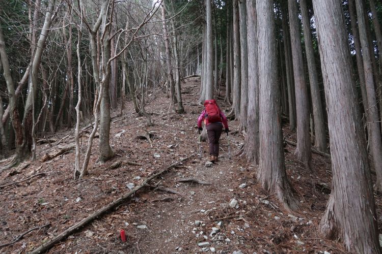九十九折りの急登になると峠は近い。スギの植林は枝打ちされてよく手入れされていた。