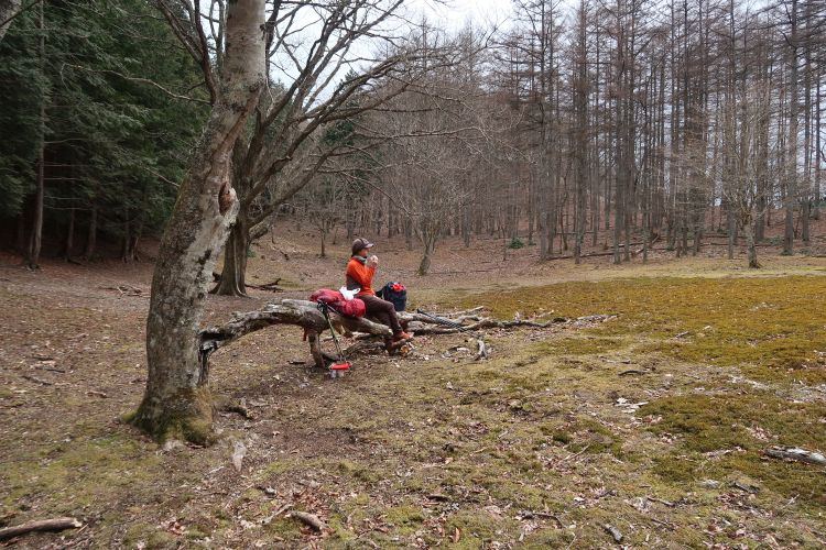 倒木に座っておにぎりとミニカップ麺を食べた。