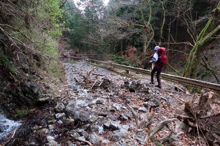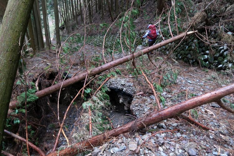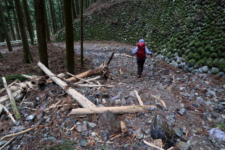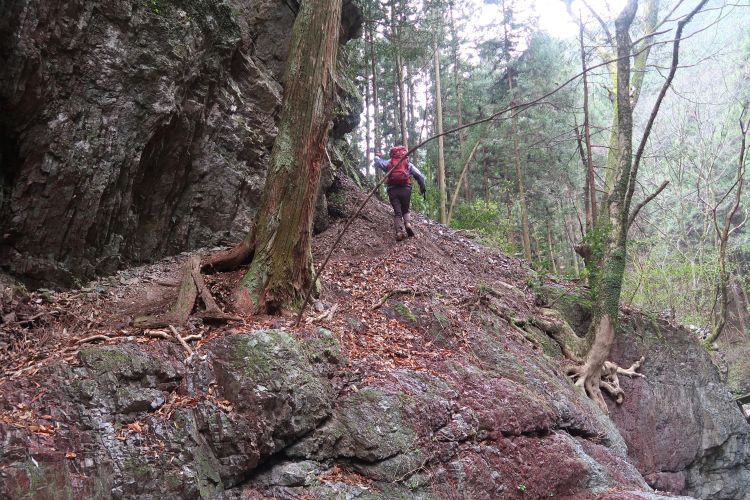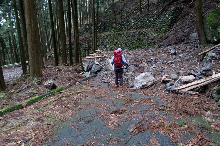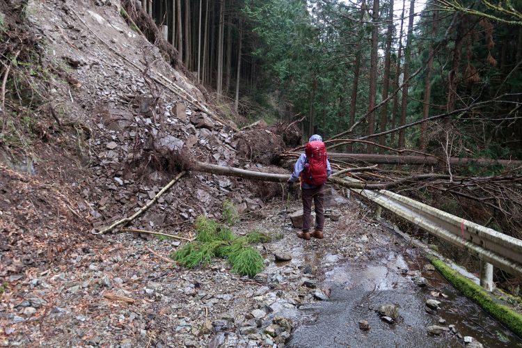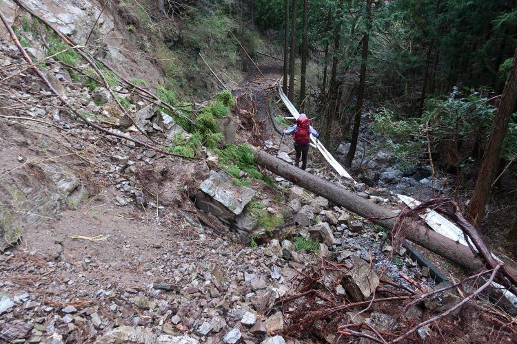 崩落していない場所も大岩が落ちてきそうに見える場所は多々あった。雨だとさらに危険度が増すわけで、歩きながらリスクの大きさをひしひしと感じていた。