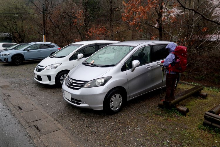 7:25 鳥首峠登山口がある白岩の林道終点に到着。一番奥に車を停めて、立ち話をしている人たちがいた。