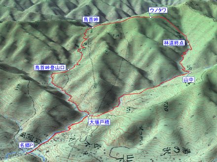 名郷駐車場 6:20 ⇒ 大場戸分岐 6:35 ⇒ 7:25 鳥首峠登山口 7:30 ⇒ 鳥首峠 8:50 ⇒ 天神山 9:30 ⇒ 9:50 ウノタワ 10:15 ⇒ 林道終点 11:15 ⇒ 大場戸分岐 12:15 ⇒ 名郷駐車場 12:30