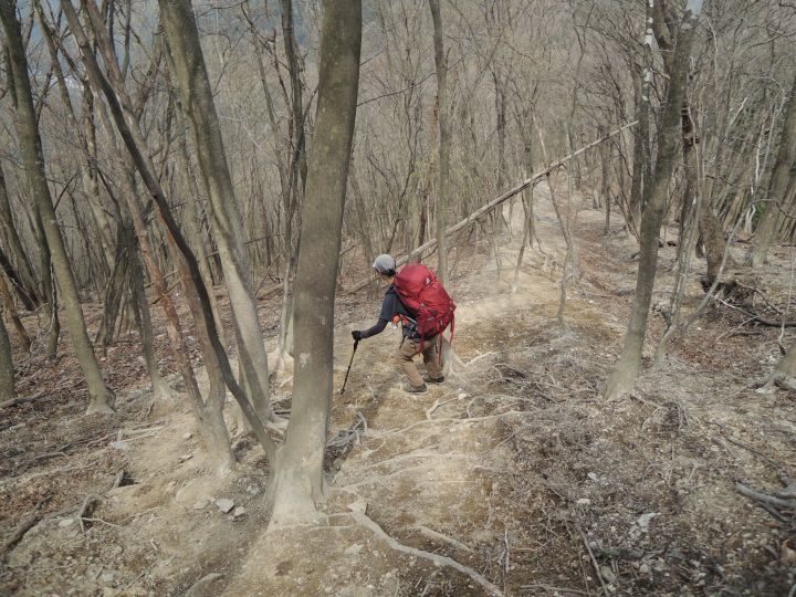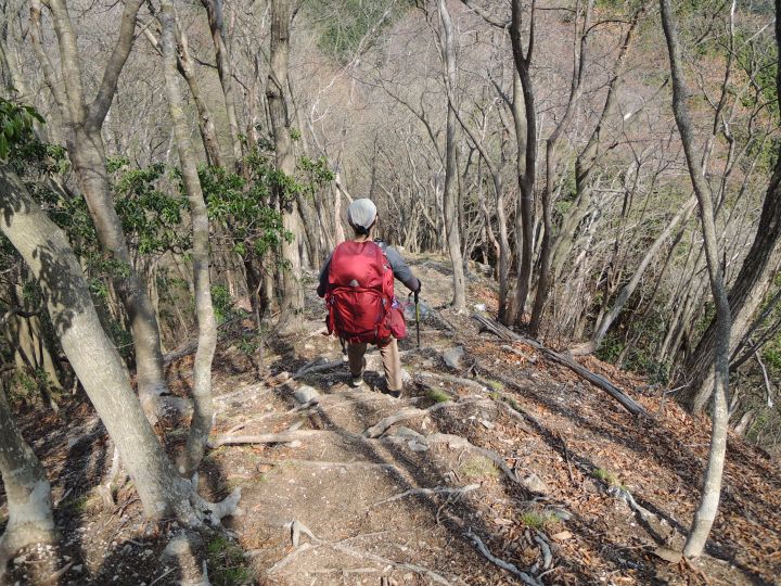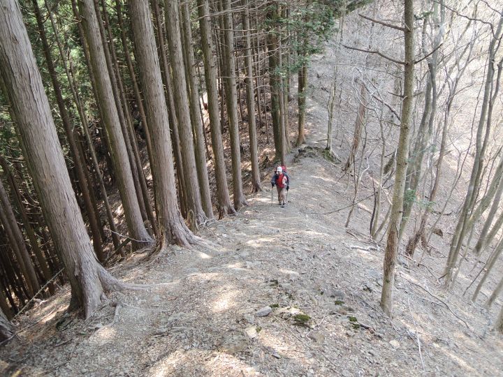 道標からは落ちるような急坂が続く。方角は合っていたが、間違っていたら上り返しが大変なので心配になった。