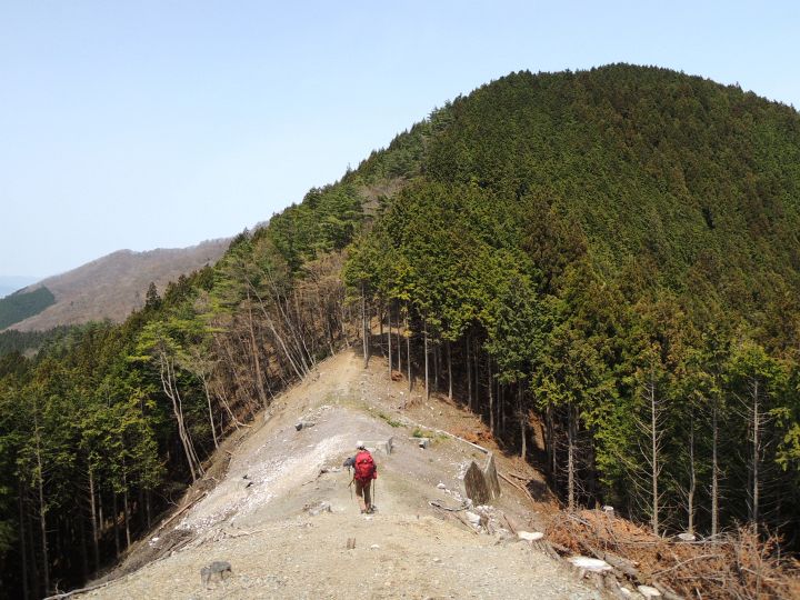 9:40 ヤシンタイノ頭(1,100m)を通過すると、開放感ある尾根歩きとなった。稜線の左側斜面は樹木が伐採されてはげ山のようになっていた。