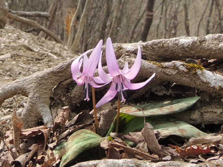 妻坂峠の前後はカタクリが至る所に咲いていた。