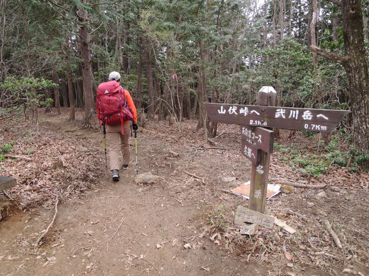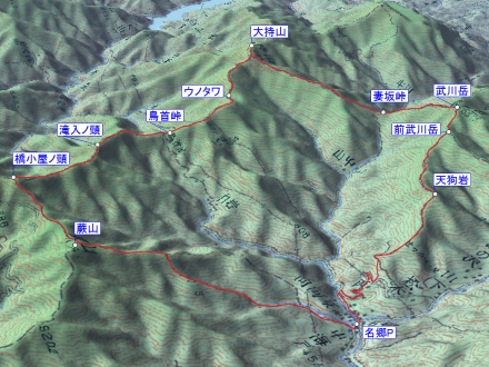 名郷駐車場 6:20 ⇒ 8:20 蕨山 8:35 ⇒ 橋小屋ノ頭(有間山) 9:15 ⇒ 滝入ノ頭 9:50 ⇒ 鳥首峠 10:30 ⇒ 11:15 ウノタワ 11:20 ⇒ 横倉山 11:45 ⇒ 大持山 12:05 ⇒ 12:50 妻坂峠 12:55 ⇒ 13:30 武川岳 14:00 ⇒ 前武川岳 14:10 ⇒ 天狗岩 14:40 ⇒ 名郷駐車場 15:45