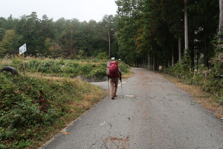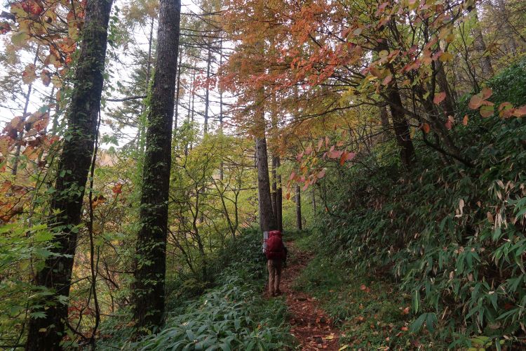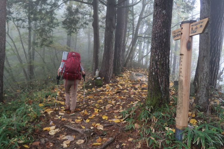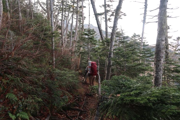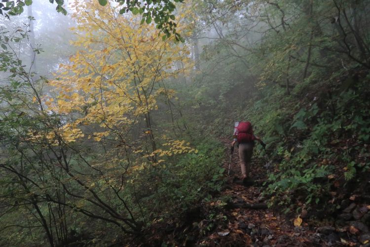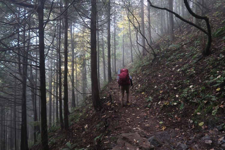 薄暗い樹林帯を進む。朝方は霧が出ていた。