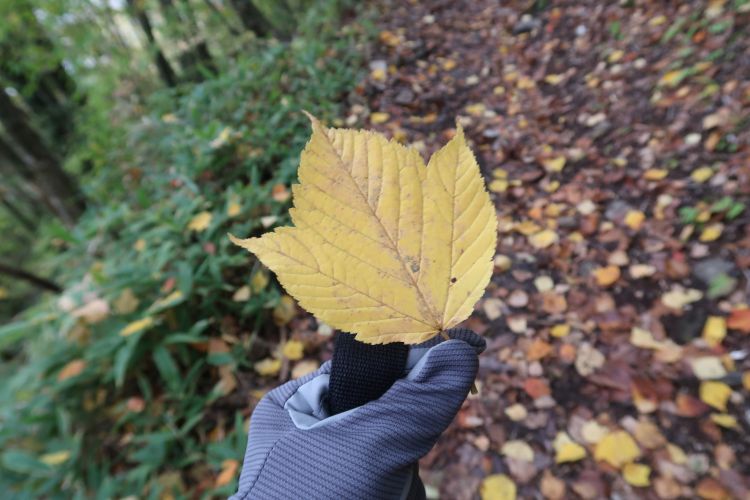 ウリハダカエデの黄葉。足元には色とりどりの落ち葉がモザイク模様に広がっていた。
