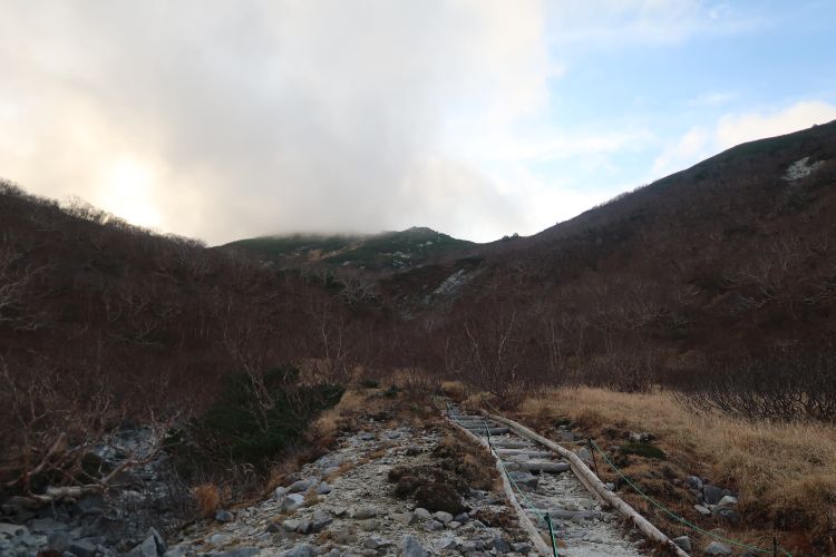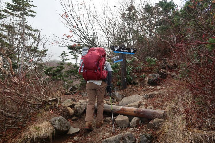 左の空木平コースへ進んだ。避難小屋が近いと知り、妻の歩きにテンポのよさが戻ってきた。