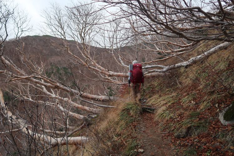 分岐から避難小屋までは平坦な道が続いた。積雪の影響か、ダケカンバが横たわるように並んでいた。