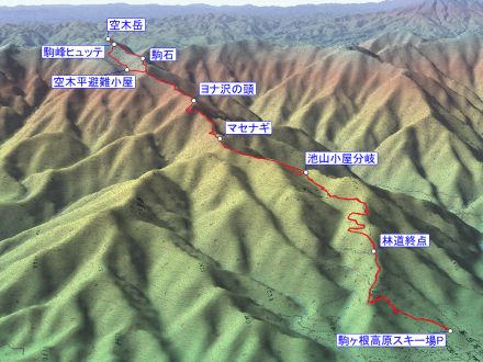 空木平避難小屋 6:20 ⇒ 8:00 空木岳 8:40 ⇒ 8:45 駒峰ヒュッテ 9:00 ⇒ 9:30 駒石 9:45 ⇒ 空木平分岐 10:10 ⇒ 11:00 ヨナ沢の頭 11:05 ⇒ マセナギ 12:40 ⇒ 13:15 池山小屋分岐 13:25 ⇒ タカウチ場 13:55 ⇒ 林道終点 14:25 ⇒ 駒ヶ根高原スキー場P 15:30