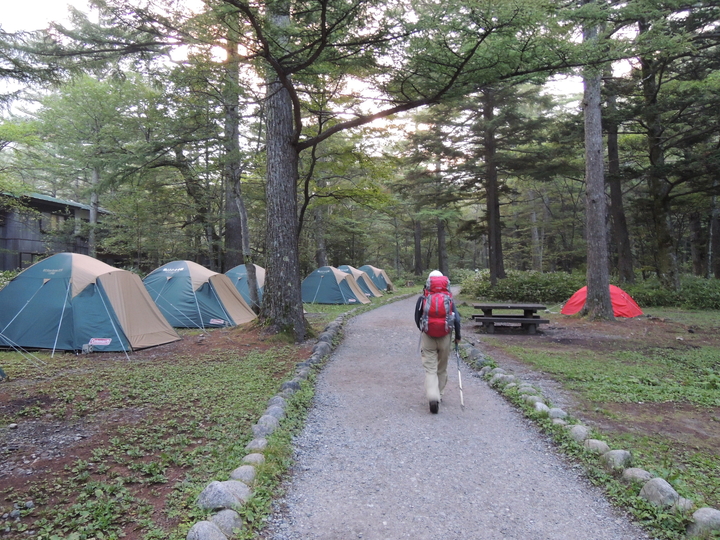 0時半起床、0時55分出発。沢渡(さわんど)の市営第2駐車場には4時20分過ぎに到着。身支度を整えてタクシーで上高地へ移動した。釜トンネルの開門時間(5時)を10分ほど待ち、上高地ビジターセンター前には5時10分に到着した。
