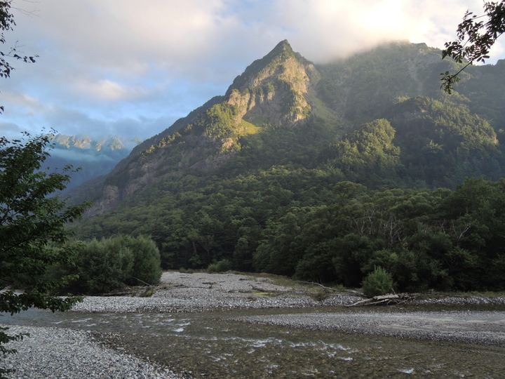 梓川の左岸につけられた平坦な遊歩道を歩いていると、時折 樹林帯がきれて、梓川の対岸に明神岳が見えた。尖頭は2263mの無名峰で雲のかかった右側が第5峰。