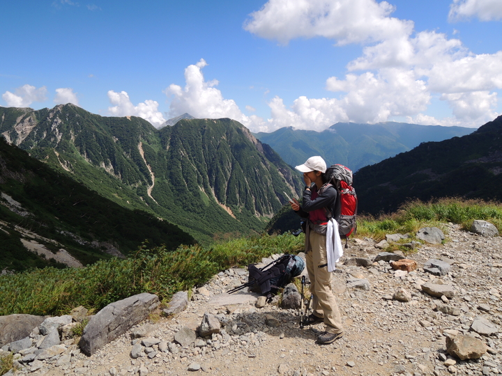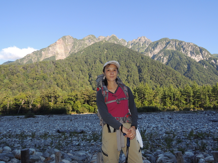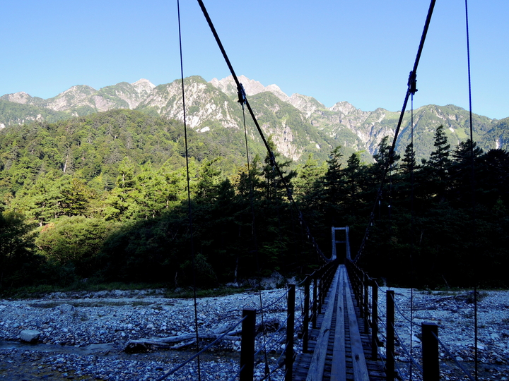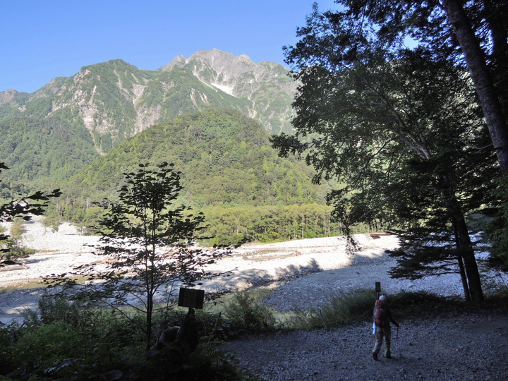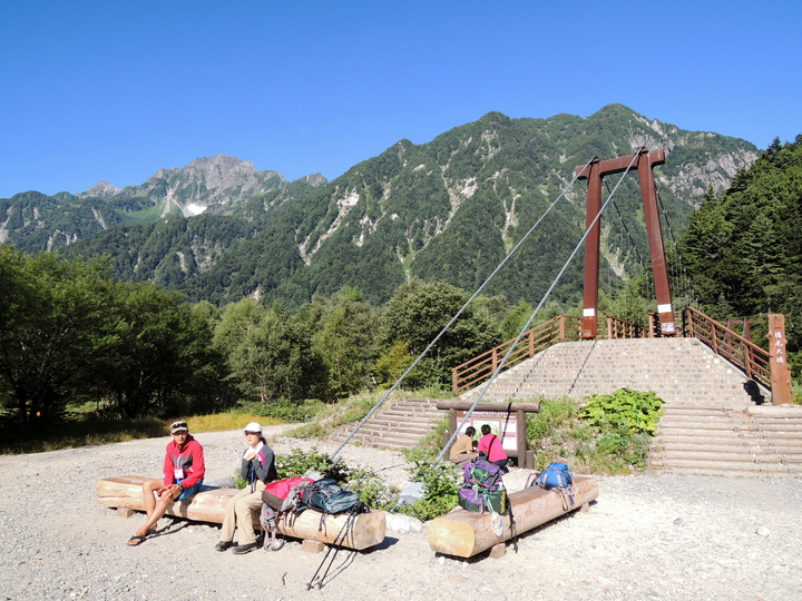 本谷橋の向こうは屏風ノ頭、左奥は前穂高岳。嫁が石井スポーツの方に、「靴の履き心地はどうか」と話しかけられた。嫁の靴は石井スポーツが扱うAKUだが、さすがに目ざとい。