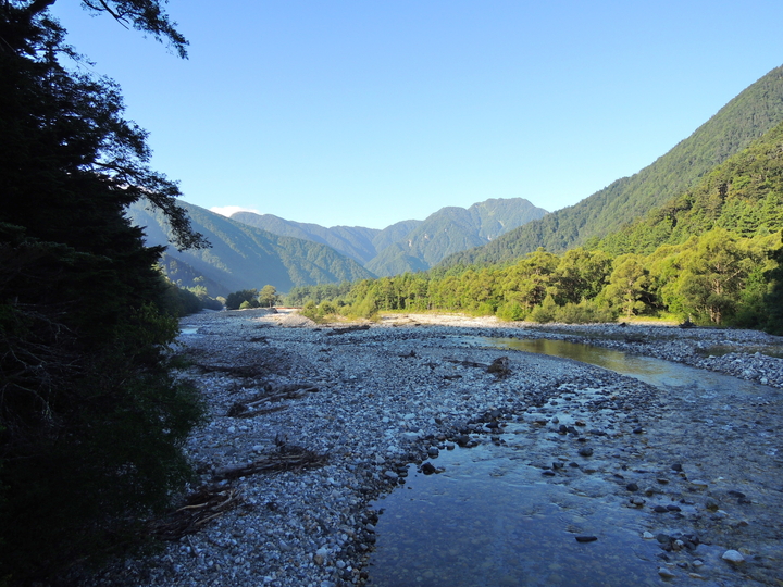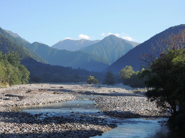 梓川の河原に出て周囲の眺めを楽しんだ。北側には大天井岳(左)と中山(右)が見えた。