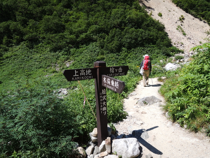 上高地バスターミナル 5:20 ⇒ 明神館 6:10 ⇒ 徳沢ロッヂ 7:00 ⇒ 8:00 横尾山荘 8:10 ⇒ 9:30 槍沢ロッヂ 9:45 ⇒ ババ平キャンプ場 10:15 ⇒ 大曲 10:35 ⇒ 11:40 天狗原分岐 11:50 ⇒ 坊主岩小屋 12:55 ⇒ (5分休憩) ⇒ 殺生分岐 13:35 ⇒ 14:15 槍ヶ岳山荘 14:20 ⇒ 14:45 槍ヶ岳 15:50 ⇒ 槍ヶ岳山荘 16:10
