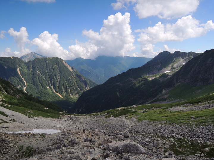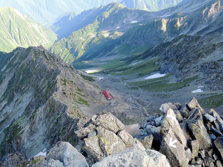 東鎌尾根の右、南東側には殺生ヒュッテと登ってきたU字谷の槍沢ルートが一望できる。