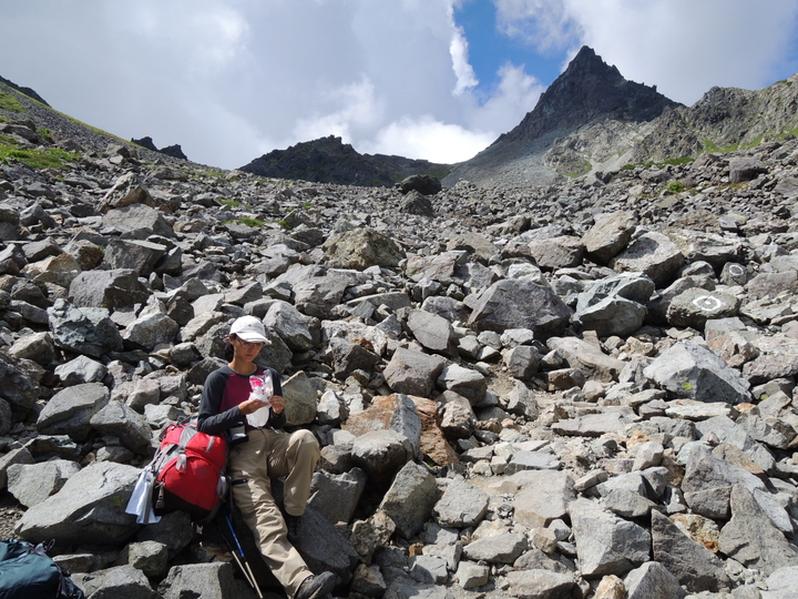 坊主岩から20分ほど上ったところで小休憩。昼食代わりに菓子パンを食べた。山頂が見えたらもう近いというのが登山におけるいつもの感覚だが、槍ヶ岳の上りはまったく違って見えてからが遠かった。