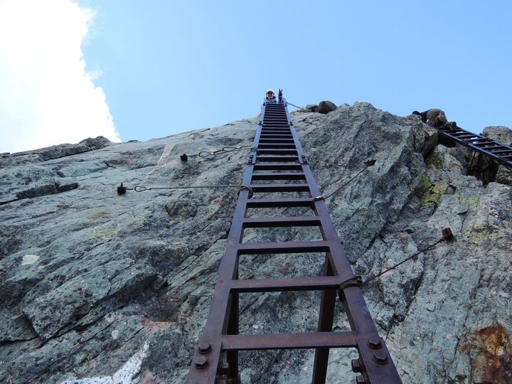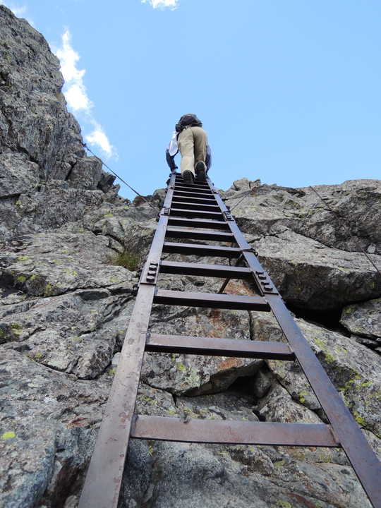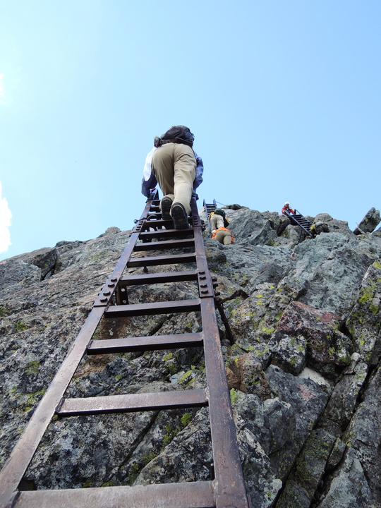 最後の長い鉄梯子を登る。山頂に出た嫁がVサインを出していた。