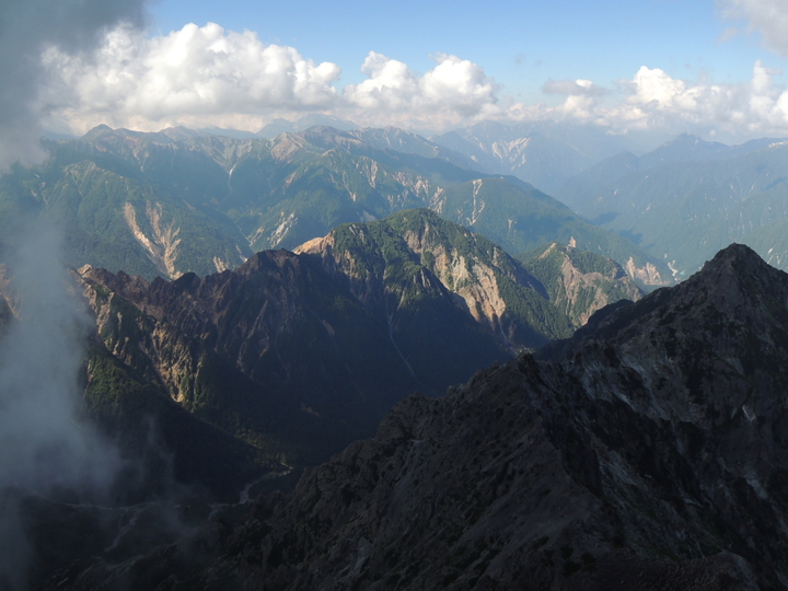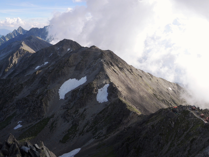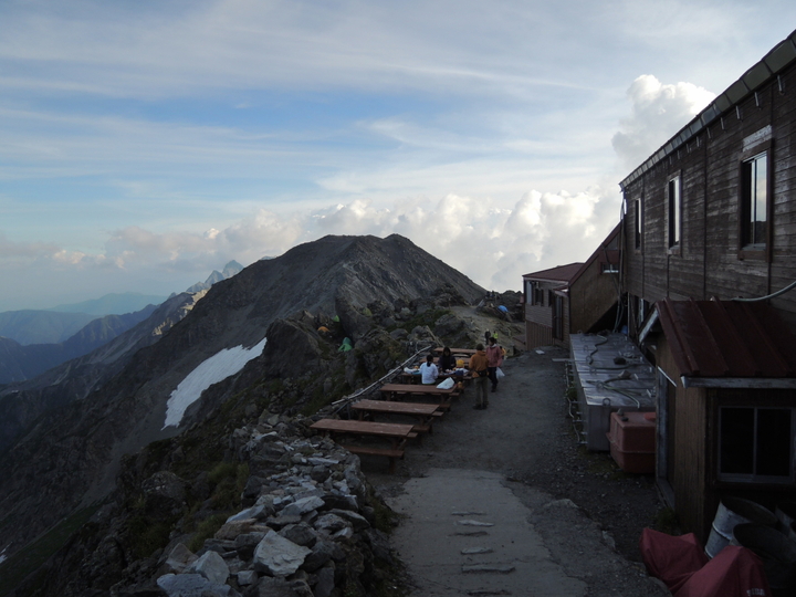 南側には、明日歩く予定の槍ヶ岳山荘から大喰岳、中岳、南岳、北穂高岳と続く稜線が一望できた。前穂高は見えたが、奥穂高は雲の中。