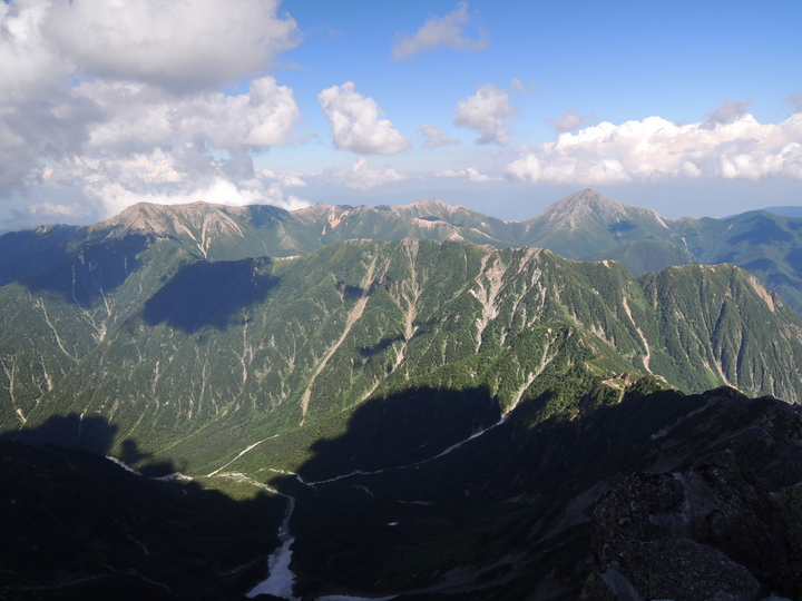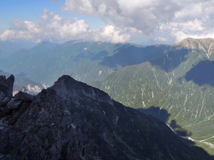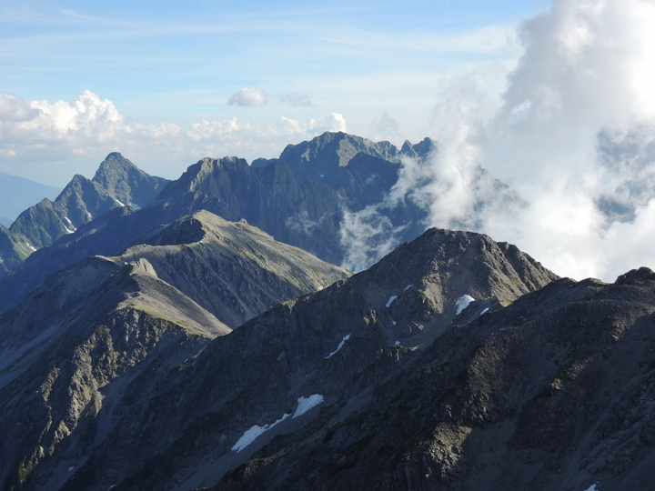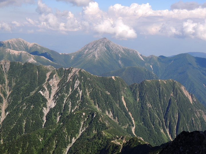 北側の眺め。右の三角は北鎌尾根の独標(2,899m)、真ん中の稜線は硫黄尾根と硫黄岳。左奥は水晶岳で、その右の立山と剣岳がかろうじて見えており、右奥の白馬三山には雲がかかっていた。